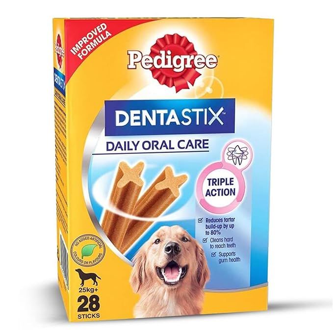 Pedigree Dentastix is a vet-recommended oral care dog treat that offers a healthy and delicious way to maintain your dog’s dental hygiene. Crafted with quality active ingredients like Zinc Sulphate and Sodium Tripolyphosphate, it helps support effective oral care while keeping teeth and gums strong. The treat’s unique X-shape and gently abrasive texture are specially designed to clean even hard-to-reach areas of the mouth, promoting gum health and fresher breath. With regular use, Pedigree Dentastix helps reduce tartar build-up by up to 80%, contributing to stronger teeth and improved overall oral health. Suitable for adult large-breed dogs weighing over 25 kg and aged above 4 months, this treat contains no added artificial colours, flavours, or sugars, making it a safe and wholesome daily dental care option.